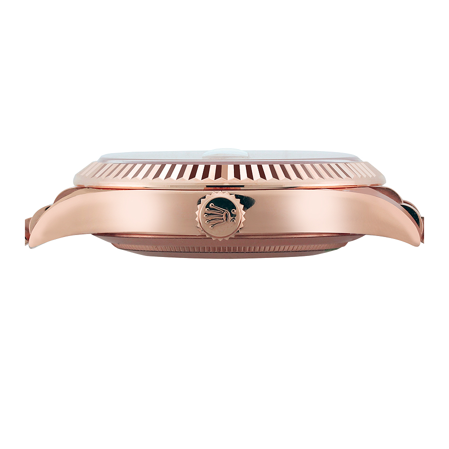 refined 40mm case in a mesmerizing rose gold hue, beautifully crafted from high-grade 904L stainless steel. The chocolate brown